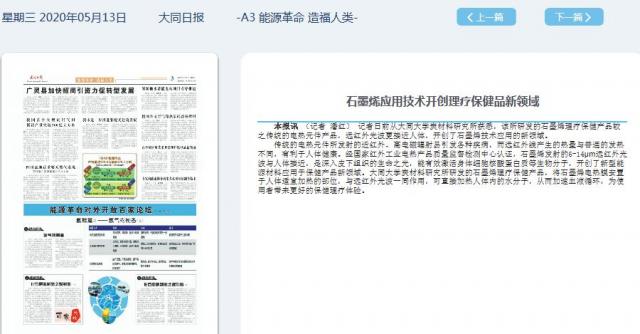 本報訊(記者 潘紅)記者日前從大同大學炭材料研究所獲悉,該所研發的石墨烯理療保健產品較之傳統的電熱元件產品,遠紅外光波更接近人體,開創了石墨烯技術應用的新領域。