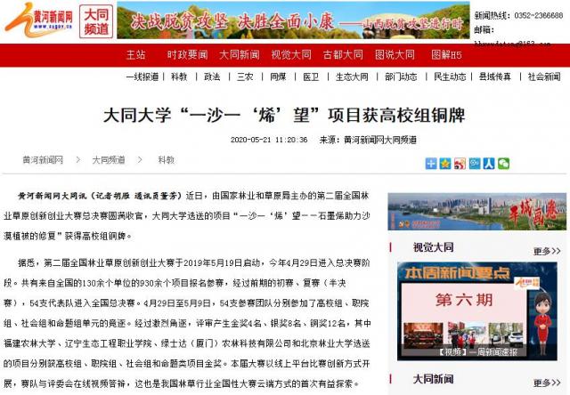 黃河新聞網大同訊(記者胡雁通訊員董芳)近日,由國家林業和草原局主辦的第二屆全國林業草原創新創業大賽總決賽圓滿收官,大同大學選送的項目“一沙一‘烯’望——石墨烯助力沙漠植被的修復”獲得高校組銅牌。