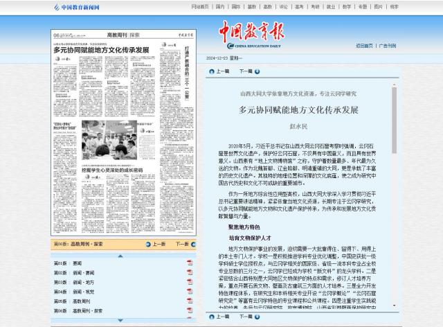學校一是注重平臺建設,獲批“雕塑藝術”“云岡舞”兩個山西省優秀傳統文化傳承基地,云岡文化生態研究院獲批山西省高校人文社科重點研究基地,學校主辦的《云岡研究》進入中國社會科學評價研究院核心期刊行列。二是注重跨學科交叉研究,與云岡研究院共同編撰《云岡石窟藝術全集》,支持教師出版《山西石窟碑刻輯錄》《塑寫華夏》等著作,深度挖掘文化價值,展現云岡石窟獨有魅力。三是注重以大同為核心的民族交往交流交融歷史研究,參與了《大同通史》《大同地區中華民族交往交流交融史》兩部專史的修撰工作。四是注重科研育人,深入推進中華優秀傳統文化特別是最新研究成果全面融入教育教學體系,把云岡文化元素融入思政課程和課程思政全過程,面向全市中小學生和研學的大學生開放文物修復實驗室、文保技術研發實驗室及云岡文化展覽館,全力打造以“云岡文化”為統領的校園文化生態,教育和引導廣大師生鑄牢中華民族共同體意識,不斷強化文物保護意識。