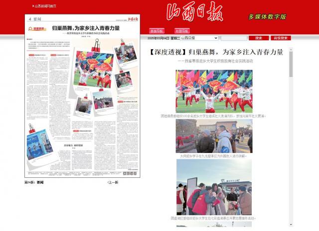 從古長城腳下的社火排練到平遙古城的文旅服務,從社區(qū)志愿者的暖心行動到為鄉(xiāng)村振興獻計獻策……2025年春節(jié)期間,三晉大地活躍著一批“歸巢燕”——數(shù)千名返鄉(xiāng)大學生利用假期,以赤子之心投身家鄉(xiāng)建設(shè),用專業(yè)所長助力文化傳承,為家鄉(xiāng)發(fā)展注入了蓬勃的青春活力……