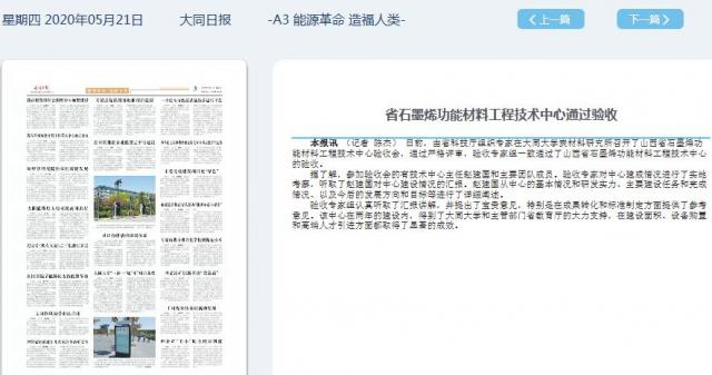 本報(bào)訊 (記者 陳杰) 日前,由省科技廳組織專家在大同大學(xué)炭材料研究所召開了山西省石墨烯功能材料工程技術(shù)中心驗(yàn)收會,通過嚴(yán)格評審,驗(yàn)收專家組一致通過了山西省石墨烯功能材料工程技術(shù)中心的驗(yàn)收。