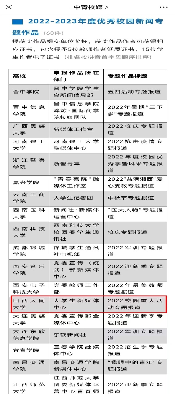 講述校園故事,弘揚(yáng)青年正能量。近日,由共青團(tuán)中央宣傳部指導(dǎo),中國青年報社、中青校媒、中國青少年新媒體協(xié)會主辦的尋找“2022—2023年度高校可視化融媒團(tuán)隊”活動獲獎名單已經(jīng)公布。校團(tuán)委學(xué)生組織大學(xué)生新媒體中心“2022校園重大活動專題報道”獲評全國“2022-2023年度優(yōu)秀校園新聞專題作品”。