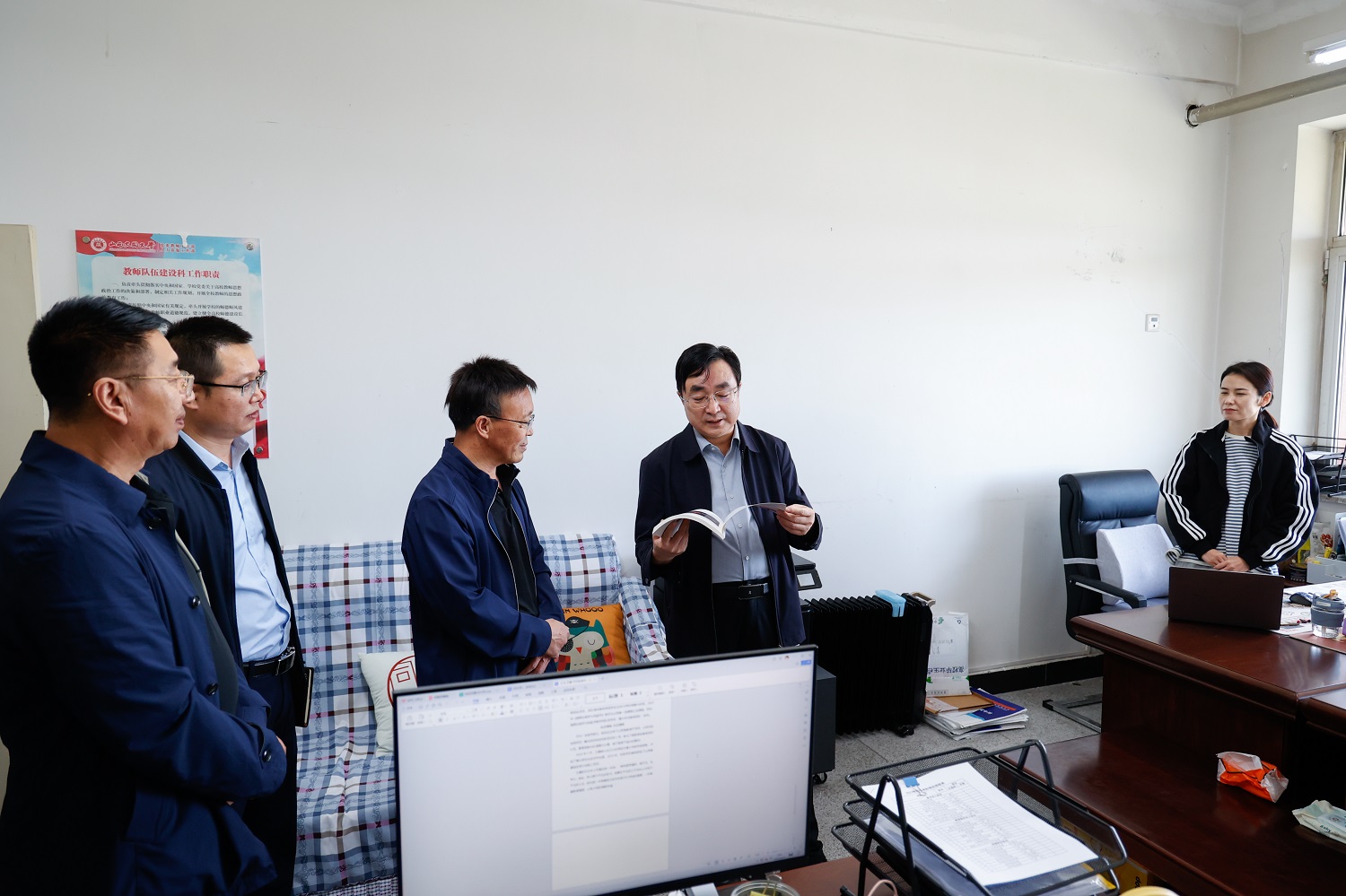 ? 9月27日,校黨委書記趙水民先后到學校行知樓各有關部門開展調研,詳細了解工作情況,看望慰問教職員工,與大家親切交流并送上節日祝福。他在調研時強調,要不斷提高執行力,以好的目標、好的計劃、好的獎懲制度、好的過程管理、好的溝通機制“五個好”狠抓工作落實,確保工作實效。