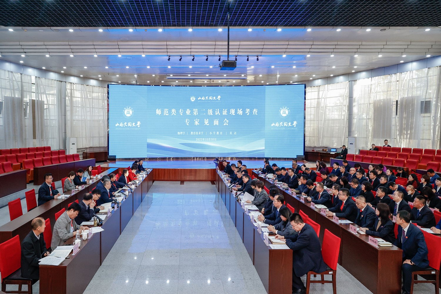 10月30日上午,專(zhuān)家見(jiàn)面會(huì)在慎思樓報(bào)告廳舉行。聯(lián)合認(rèn)證專(zhuān)家組組長(zhǎng)、小學(xué)教育專(zhuān)業(yè)專(zhuān)家組組長(zhǎng)、江蘇師范大學(xué)原副校長(zhǎng)錢(qián)進(jìn),英語(yǔ)專(zhuān)業(yè)專(zhuān)家組組長(zhǎng)、西南大學(xué)國(guó)際學(xué)院院長(zhǎng)劉承宇,教育技術(shù)學(xué)專(zhuān)業(yè)專(zhuān)家組組長(zhǎng)、東北師范大學(xué)教務(wù)處副處長(zhǎng)趙長(zhǎng)明,物理學(xué)專(zhuān)業(yè)專(zhuān)家組組長(zhǎng)、云南師范大學(xué)評(píng)估中心原主任、本科教學(xué)督導(dǎo)團(tuán)團(tuán)長(zhǎng)畢先均等16位專(zhuān)家,山西省委教育工作委員會(huì)主持日常工作的副書(shū)記(正廳長(zhǎng)級(jí))、省教育廳黨組成員楊軍,山西省教育廳教師工作處副處長(zhǎng)李鵬,山西教育雜志社主編王剛,大同市政府副秘書(shū)長(zhǎng)曹暉,大同市委教育工作委員會(huì)委員、市教育局黨組成員、總督學(xué)李文麗,全體校領(lǐng)導(dǎo)出席會(huì)議。相關(guān)職能部門(mén)負(fù)責(zé)人、認(rèn)證專(zhuān)業(yè)所在學(xué)院班子全體成員及專(zhuān)業(yè)負(fù)責(zé)人、其他師范類(lèi)專(zhuān)業(yè)所在學(xué)院黨政負(fù)責(zé)人參加會(huì)議。
