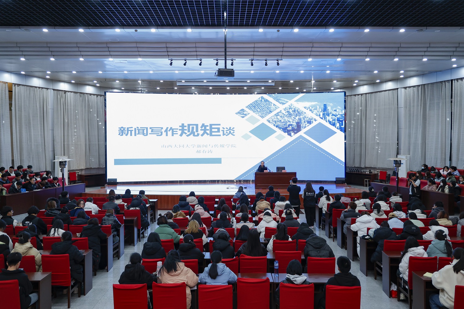 11月29日,山西大同大學校園新聞業務能力提升系列專題培訓第二講在慎思樓報告廳舉行,新聞與傳媒學院院長、教授、碩士生導師郝春濤作《新聞規矩談》講座。附屬中學校長、黨委宣傳部副部長王麗芹主持講座。