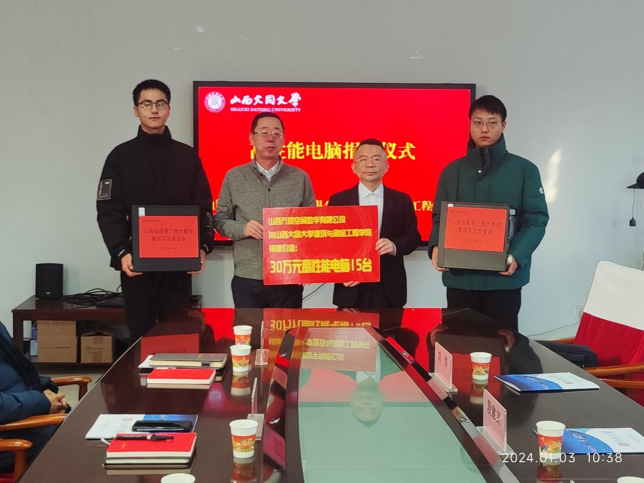 1月3日,山西萬鼎空間數字有限公司向建筑與測繪工程學院捐贈價值30萬元高性能電腦15臺,捐贈儀式在新平旺校區辦公樓一層會議室舉行。學院黨委書記馬云波、黨委副書記姚占魁、副院長徐廣翔、副院長喬棟,山西萬鼎空間數字有限公司董事長段建文、副總經理劉洋、副總經理李日增、董事長助理張義杰等出席本次儀式,建測學院相關專業師生代表參加捐贈儀式。儀式由馬云波主持。