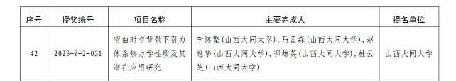 近日,山西省人民政府發布《關于2023年度山西省科學技術獎勵的決定》,對為我省科學技術進步和經濟社會高質量發展作出突出貢獻的科研工作者和組織給予獎勵。由我校完成的“彎曲時空背景下引力體系熱力學性質及其潛在應用研究”獲自然科學獎二等獎。