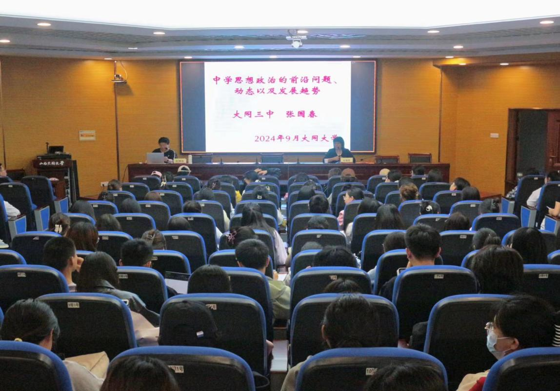 為進一步提高師范生的教師專業(yè)素養(yǎng),提升師范生實踐能力,以促進學生全面發(fā)展和教學水平進步,9月13日,馬克思主義學院舉辦以“中學思想政治的前沿問題、動態(tài)以及發(fā)展趨勢”為主題的教育研習講座。本次講座特邀大同第三中學校張國春老師主講,馬克思主義學院副院長杜海燕主持,思想政治教育專業(yè)2021級全體學生參加。