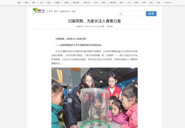 從古長城腳下的社火排練到平遙古城的文旅服務,從社區志愿者的暖心行動到為鄉村振興獻計獻策……2025年春節期間,三晉大地活躍著一批“歸巢燕”——數千名返鄉大學生利用假期,以赤子之心投身家鄉建設,用專業所長助力文化傳承,為家鄉發展注入了蓬勃的青春活力……