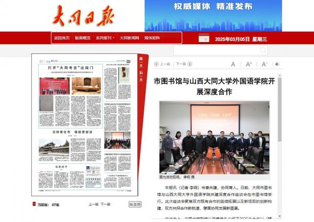 此次座談會為山西大同大學外國語學院與大同市圖書館的深度合作錨定了方向,雙方將以更加務實的舉措,推動教育資源與公共文化服務深度融合,助力地方文化繁榮與社會發展,在知識傳播、文化傳承創新等方面發揮更大效能,為構建學習型社會貢獻力量。