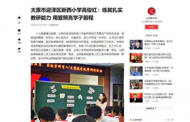 十七載漫漫從教路,太原市迎澤區新西小學教師高俊紅憑著共產黨員的赤誠,用愛滋養著每一名學生。她心如花木,向暖而生,用心對待每一名學生,讓學生們感受到愛與溫暖。面對新課程改革,她始終保持與時俱進、積極進取的工作狀態,積極投身各種教研活動及教學比賽的備課研討中,練就了扎實的教科研能力。自工作以來,她榮獲過全國第十三屆優質課一等獎、全國小學英語兩岸四地教學大賽一等獎、山西省基礎教育三優工程市級優質課一等獎、山西省基礎教育三優工程市級特色影像一等獎等,多次承擔山西省教育廳國培送教下鄉等工作。