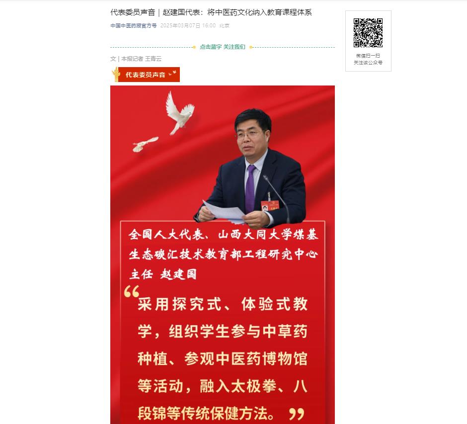 3月6日,中華人民共和國最高人民法院官網、《人民法院報》推出專題報道《全國人大代表、山西大同大學煤基生態碳匯技術教育部工程研究中心主任趙建國:以改革創新助力綠色發展》,趙建國表示,希望通過科技賦能司法,織牢織密生態環境保護網,一體推動山西“四山”“兩河”、長城、石窟生態環境保護,在守護美麗大同、美麗山西上充分展現全國人大代表的擔當作為。